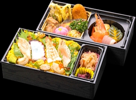 海鮮の乗ったちらし寿司と色とりどりのおかずを2段のお弁当に敷き詰めました。ボリュームも美味しさも満足いただけるお弁当となっております。